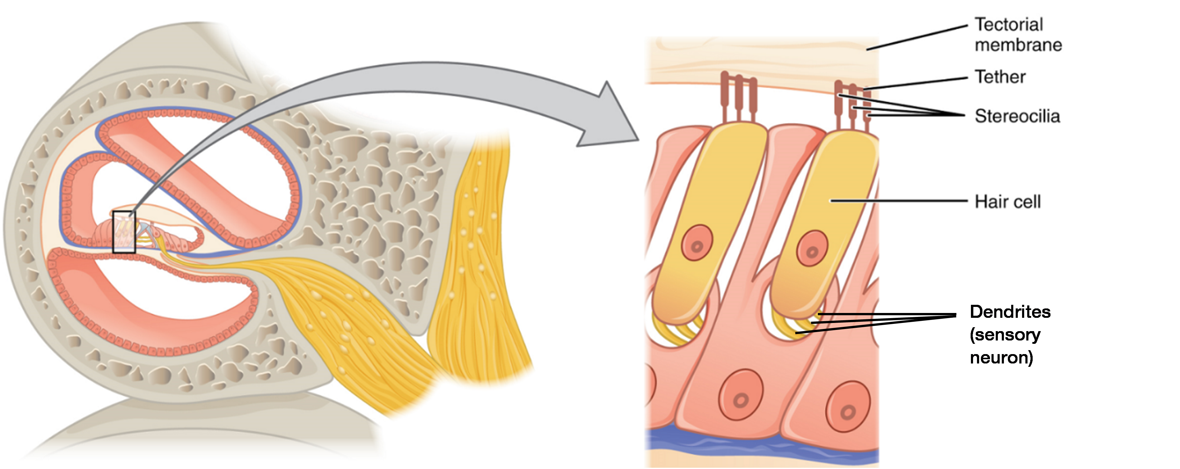 The organ of Corti contains hair cells, which are named for the hair-like stereocilia extending from the cell’s apical surfaces (Figure 7). There are two main types of hair cells: the inner hair cells and the outer hair cells. Only the inner hair cells serve as hearing receptors. The stereocilia are an array of microvilli-like structures arranged from tallest to shortest. Protein fibers tether adjacent hairs together within each array, such that the array will bend in response to movements of the basilar membrane. The stereocilia extend up from the hair cells to the overlying gel-like tectorial membrane. When the pressure waves of endolymph in the cochlear duct vibrate the basilar membrane, the hair cells move as well. These vibrations bend the stereocilia either toward or away from the tallest member of each array of stereocilia. In inner hair cells, when the stereocilia bend toward the tallest member of their array, tension in the protein tethers opens ion channels in the cell membrane. This will further depolarize the cell membrane, exciting the sensory neurons innervating the hair cells and triggering nerve impulses which travel down the afferent nerve fibers of the cochlear branch of the vestibulocochlear nerve. When the stereocilia bend toward the shortest member of their array, the tension on the tethers slackens and the ion channels close. When no sound is present, and the stereocilia are standing straight, a small amount of tension still exists on the tethers, keeping the membrane potential of the hair cell slightly depolarized. The sterocilia of outer hair cells also bend back and forth in response to the vibrating basilar membrane. However, unlike inner hair cell, they do not serve as sensory receptors, but instead modulate the stiffness of the basilar membrane. This helps inner hair cells be more responsive to certain sounds or protects these cells from potentially damaging sounds.