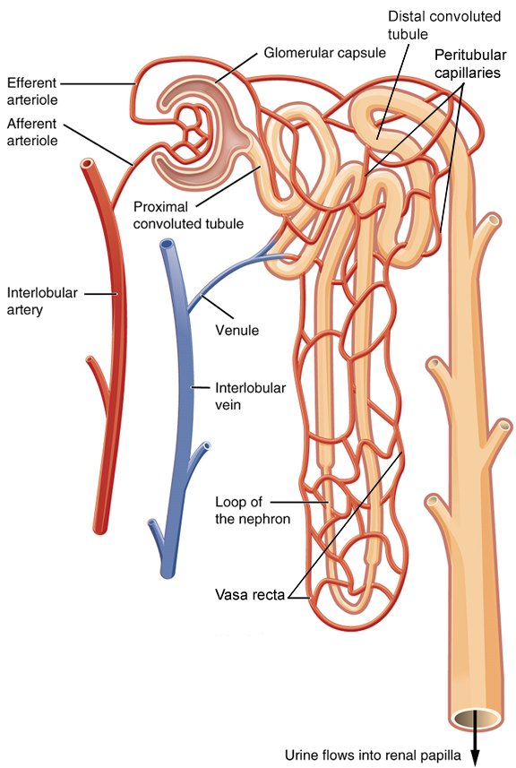 Nephrons are the functional unit of the kidney; they take a simple filtrate of the blood and modify it into urine. They cleanse the blood and maintain the levels of blood chemical components within physiological values. The afferent arterioles form a tuft of high-pressure capillaries, the glomerulus. The rest of the nephron consists of a continuous tubule, the proximal end of which surrounds the glomerulus—this is Bowman’s capsule or glomerular capsule. As mentioned earlier, these glomerular capillaries filter the blood based on particle size.