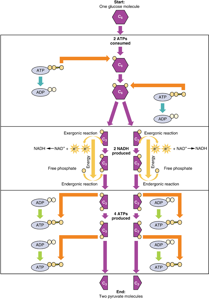This equation states that glucose – in combination with ATP (a source of chemical energy), nicotinamide adenine dinucleotide (NAD+, a coenzyme that serves as an electron acceptor), and inorganic phosphate – breaks down into two pyruvate molecules, generating four ATP molecules – for a net yield of two ATP – and two energy-containing NADH coenzyme molecules (resulting from adding a hydrogen atom and an extra electron to NAD+). The NADH that is produced in this process will be used later to produce ATP in the mitochondria. Importantly, by the end of this process, one glucose molecule generates two pyruvate molecules, two high-energy ATP molecules, and two electron-carrying NADH molecules.