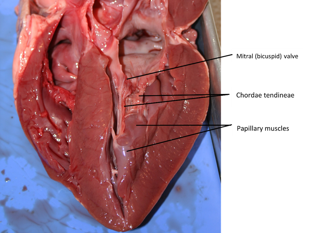 Left Ventricle: Recall that, although both sides of the heart will pump the same amount of blood, the muscular layer is much thicker in the left ventricle compared to the right (Figure 13). The mitral valve is connected to papillary muscles via chordae tendineae. There are two papillary muscles on the left – the anterior and posterior – as opposed to three on the right. The left ventricle is the major pumping chamber for the systemic circuit; it ejects blood into the aorta through the aortic semilunar valve.