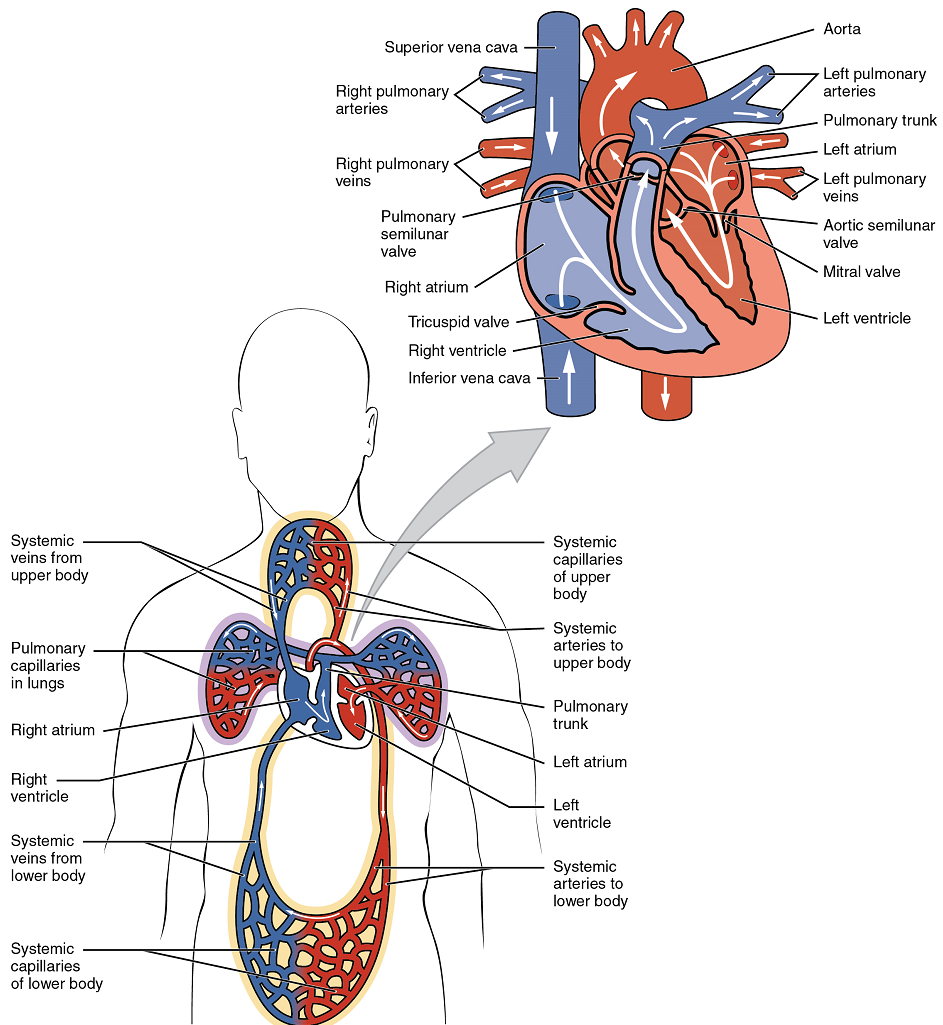 The blood exiting the systemic capillaries is lower in oxygen concentration than when it entered. The capillaries will ultimately unite to form venules, joining to form ever-larger veins, eventually flowing into the two major systemic veins, the superior vena cava and the inferior vena cava, which return blood to the right atrium. The blood in the superior and inferior venae cavae flows into the right atrium, which pumps blood into the right ventricle. This process of blood circulation continues as long as the individual remains alive. Understanding the flow of blood through the pulmonary and systemic circuits is critical to all health professions (Figure 2).