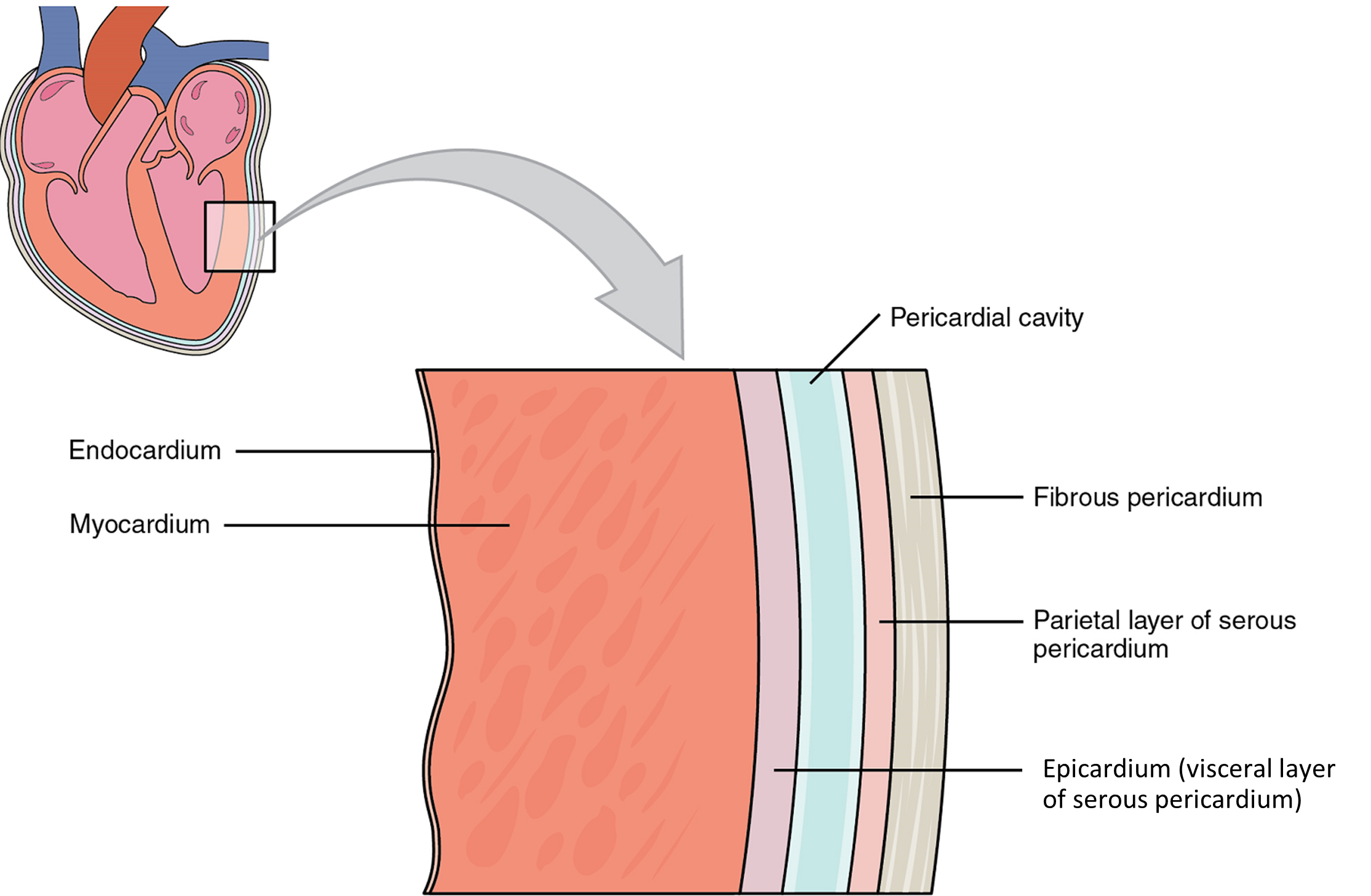 Membranes: The membrane that directly surrounds the heart and defines the pericardial cavity is called the pericardium or pericardial sac (Figure 3). It also surrounds the “roots” of the major vessels, or the areas of closest proximity to the heart. The pericardium, which literally translates as “around the heart,” consists of two distinct sublayers. The sturdy outer layer is the fibrous pericardium, made of tough, dense connective tissue that protects the heart and maintains its position in the thorax. The inner serous pericardium consists of two layers: the outer parietal pericardium, which is fused to the fibrous pericardium, and an inner visceral pericardium, or epicardium, which is fused to the heart and is part of the heart wall. The pericardial cavity, filled with lubricating serous fluid, lies between the epicardium (visceral pericardium) and the parietal pericardium. Like the other serous membranes in the body, both the visceral and parietal pericardium consist of simple squamous epithelium, but unlike many of these membranes these are reinforced with connective tissue (loose irregular and areolar). The epithelial tissue of the epicardium (visceral pericardium) secretes the lubricating serous fluid that fills the pericardial cavity and reduces friction as the heart contracts.