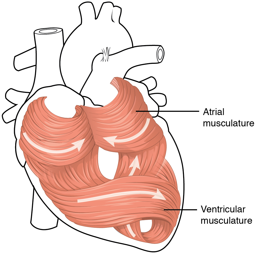 The middle and thickest layer is the myocardium, made largely of cardiac muscle cells. It is built upon a framework of collagenous fibres, plus the blood vessels that supply the myocardium and the nerve fibres that help regulate the heart. It is the contraction of the myocardium that pumps blood through the heart and into the major arteries. The muscle pattern is elegant and complex, as the muscle cells swirl and spiral around the chambers of the heart (Figure 5). They form a figure 8 pattern around the atria and around the bases of the great vessels. Deeper ventricular muscles also form a figure 8 around the two ventricles and proceed toward the apex. More superficial layers of ventricular muscle wrap around both ventricles. This complex swirling pattern allows the heart to pump blood more effectively than a simple linear pattern would.