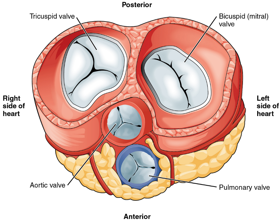 A transverse section through the heart slightly above the level of the atrioventricular septum reveals all four heart valves along the same plane (Figure 9). The valves ensure unidirectional blood flow through the heart. Between the right atrium and the right ventricle is the right atrioventricular valve, or tricuspid valve. It typically consists of three cusps or flaps, or leaflets, made of endocardium reinforced with additional connective tissue. Each flap of the valve is attached to strong strands of connective tissue, the chordae tendineae, literally “tendinous cords,” or sometimes more poetically referred to as “heart strings” (Figure 8). There are several chordae tendineae associated with each of the flaps. They are composed of approximately 80% collagenous fibres with the remainder consisting of elastic fibres and endothelium. They connect each of the flaps to a papillary muscle that extends from the inferior ventricular surface (Figure 8).