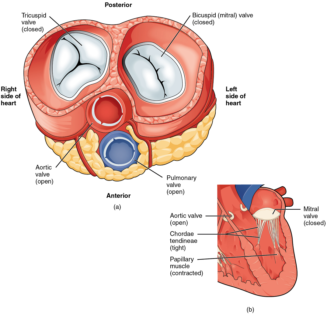 When the myocardium of the ventricle contracts, pressure within the ventricular chamber rises. Blood, like any fluid, flows from higher pressure to lower pressure areas, in this case, toward the pulmonary trunk and the atrium. To prevent any potential backflow, the tricuspid valve also closes. The papillary muscles also contract, generating tension on the chordae tendineae. This prevents the flaps of the valves from being forced into the atria and regurgitation of the blood back into the atria during ventricular contraction.