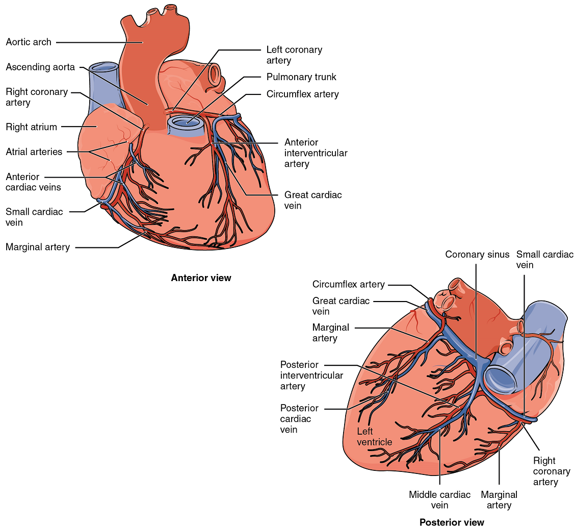 You will recall that the heart is a remarkable pump composed largely of cardiac muscle cells that are incredibly active throughout life. Like all other cells, a cardiomyocyte (cardiac muscle cell) requires a reliable supply of oxygen and nutrients, and a way to remove wastes, so it needs a dedicated, complex, and extensive coronary circulation. And because of the critical and nearly ceaseless activity of the heart throughout life, this need for a blood supply is even greater than for a typical cell. However, coronary circulation is not continuous; rather, it cycles, reaching a peak when the heart muscle is relaxed and nearly ceasing while it is contracting.