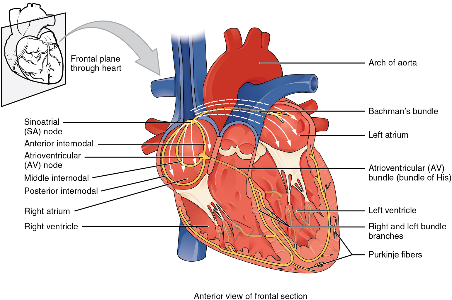 If embryonic heart cells are separated into a Petri dish and kept alive, each is capable of generating its own electrical impulse followed by contraction. When two independently beating embryonic cardiac muscle cells are placed together, the cell with the higher inherent rate sets the pace, and the impulse spreads from the faster to the slower cell to trigger a contraction. As more cells are joined together, the fastest cell continues to assume control of the rate. A fully developed adult heart maintains the capability of generating its own electrical impulse, triggered by the fastest cells, as part of the cardiac conduction system. The components of the cardiac conduction system include the sinoatrial node (SA node), the atrioventricular node (AV node), the atrioventricular bundle (bundle of His), the atrioventricular bundle branches, and the Purkinje fibres (Figure 13).