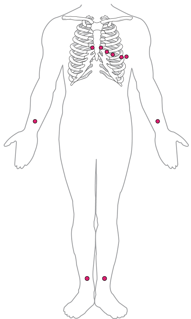 By careful placement of surface electrodes on the body, it is possible to record the complex, compound electrical signal of the heart. This tracing of the electrical signal is the electrocardiogram (ECG), also commonly abbreviated EKG (K coming from kardiology, from the German term for cardiology). Careful analysis of the ECG reveals a detailed picture of both normal and abnormal heart function, and is an indispensable clinical diagnostic tool. The standard electrocardiograph (the instrument that generates an ECG) uses 3, 5, or 12 leads. The greater the number of leads an electrocardiograph uses, the more information the ECG provides. The term “lead” may be used to refer to the cable from the electrode to the electrical recorder, but it typically describes the voltage difference between two of the electrodes. The 12-lead electrocardiograph uses 10 electrodes placed in standard locations on the patient’s skin (Figure 17).