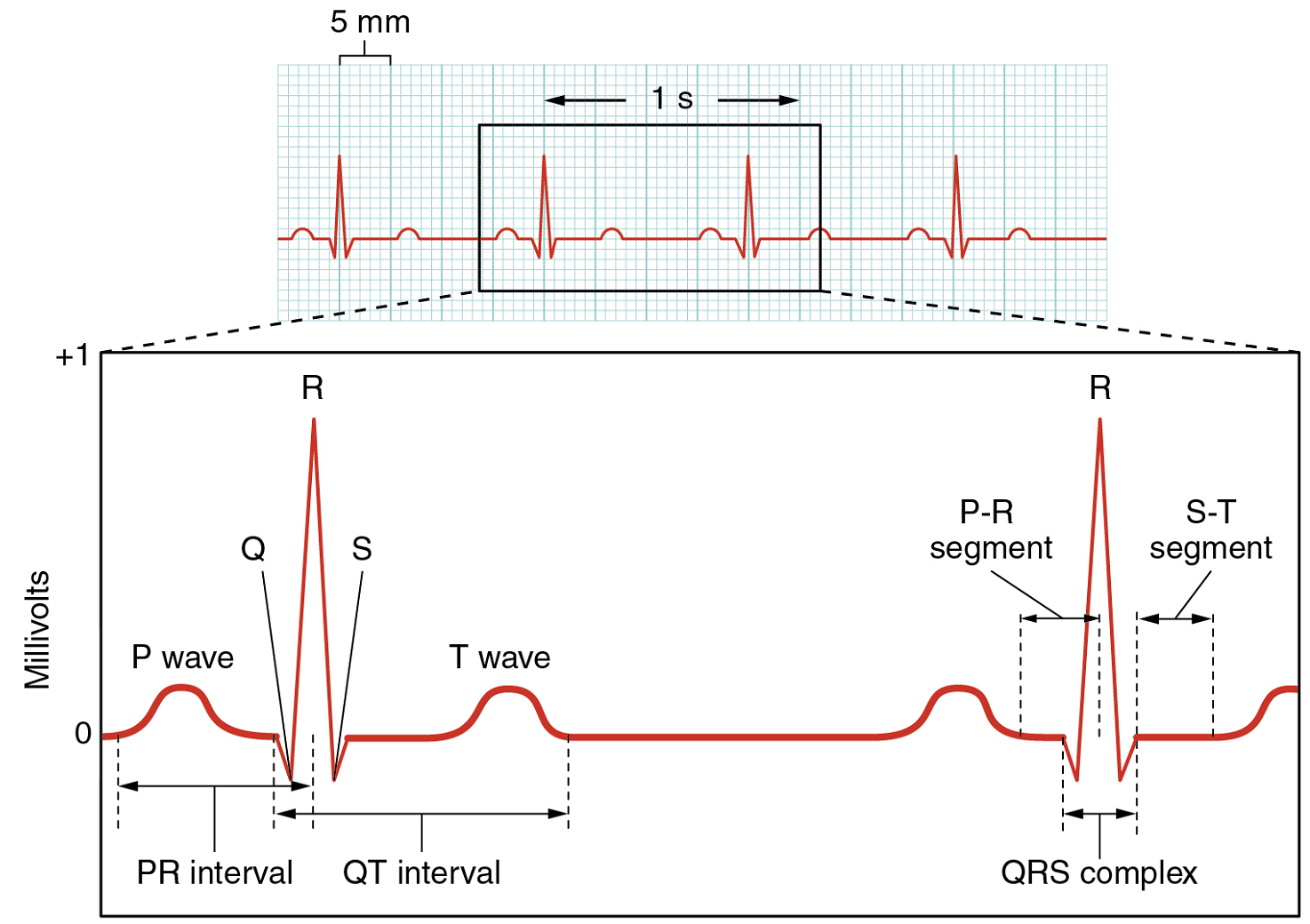 There are five prominent points on the ECG: the P wave, the QRS complex, and the T wave (Figure 18). The small P wave represents the depolarization of the atria. The atria begin contracting approximately 25 ms after the start of the P wave. The large QRS complex represents the depolarization of the ventricles, which requires a much stronger electrical signal because of the larger size of the ventricular cardiac muscle. The ventricles begin to contract as the QRS reaches the peak of the R wave. Lastly, the T wave represents the repolarization of the ventricles. The repolarization of the atria occurs during the QRS complex, which masks it on an ECG.