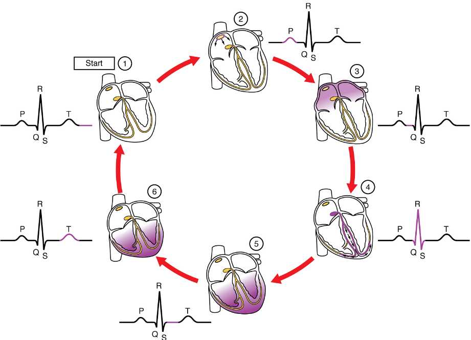 (5) The impulse spreads to the contractile fibres of the ventricle. (6) Ventricular contraction begins.