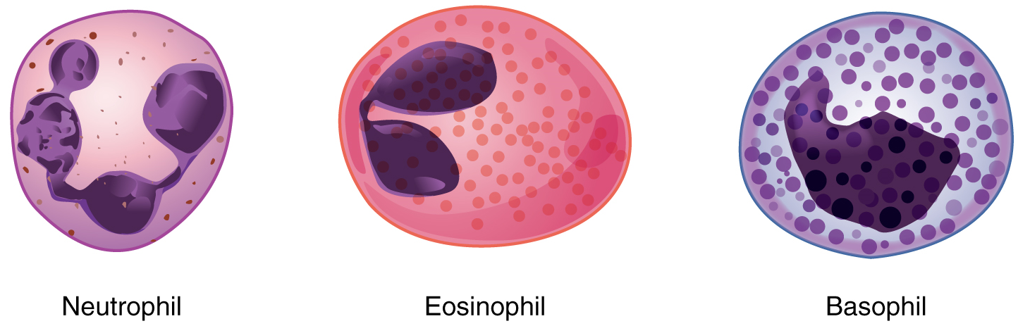 Granular Leukocytes: We will consider the granular leukocytes in order from most common to least common. All of these are produced in the red bone marrow and have a short lifespan of hours to days. They typically have a lobed nucleus and are classified according to which type of stain best highlights their granules (Figure 5).