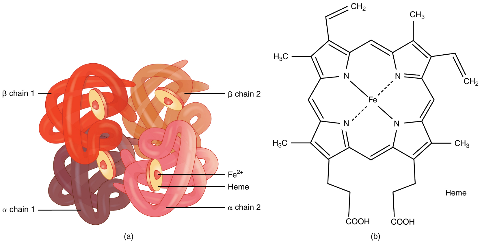 Hemoglobin is a large molecule made up of proteins and iron. It consists of four folded chains of a protein called globin, designated alpha 1 and 2, and beta 1 and 2 (Figure 4a). Each of these globin molecules is bound to a red pigment molecule called heme, which contains an ion of iron (Fe2+) (Figure 4b).